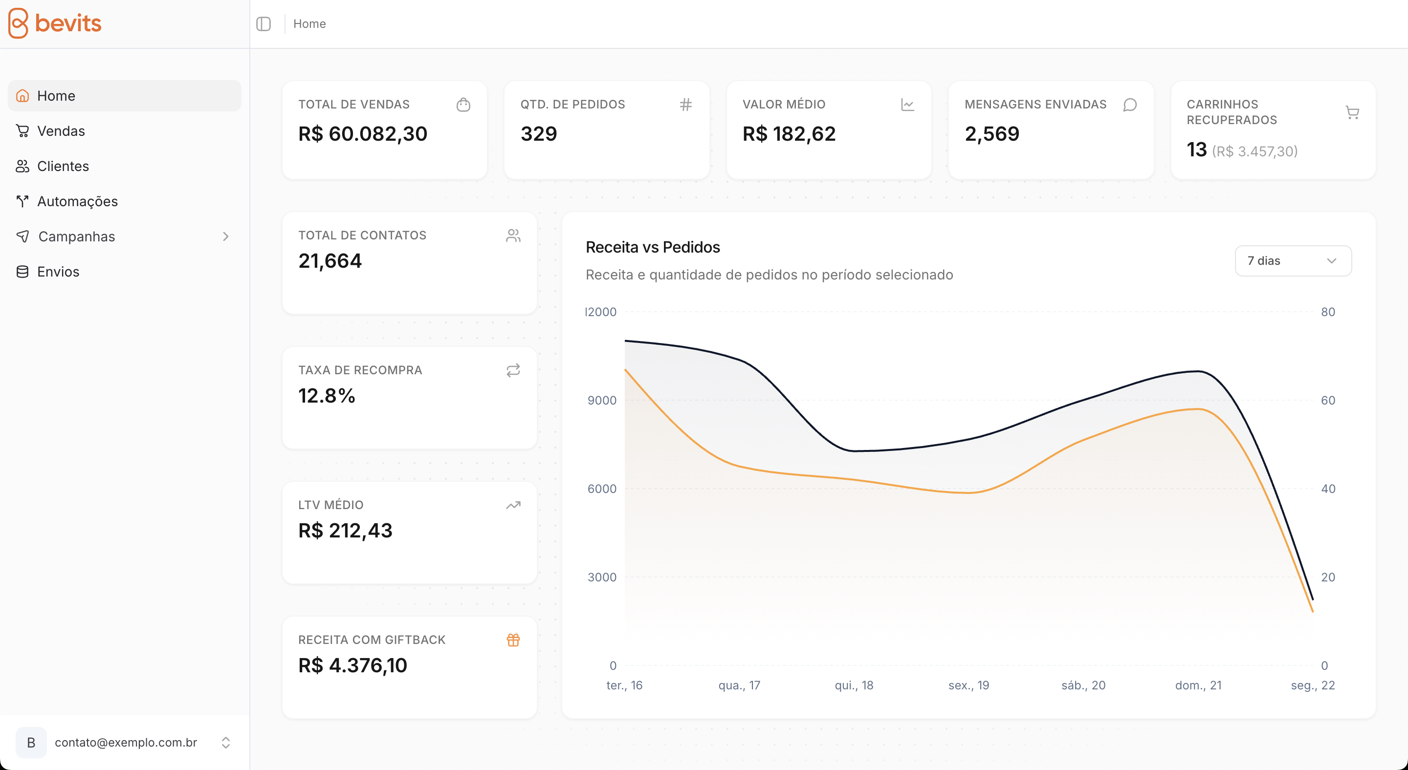 Agora você consegue ver direto no dashboard da Bevits os dados de recuperação de carrinhos abandonados. Quantos carrinhos foram recuperados e quanto isso representou financeiramente para a sua loja.